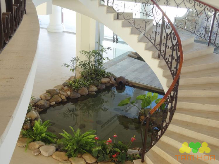 Loại hồ cá koi mini này đặc biệt phù hợp đối với những không gian nhà nhỏ hẹp. Vị trí xây dựng tốt nhất là ở phía dưới chân cầu thang nhằm đảm bảo vừa hứng được ánh nắng mặt trời, lại thuận lợi cho việc ngắm nhìn của bạn khi ngồi ở phòng khách.